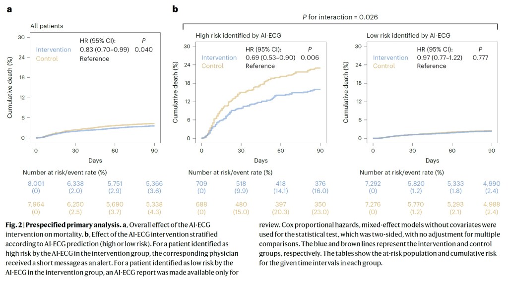 The early identification of vulnerable patients has the potential to improve outcomes but poses a substantial challenge in clinical practice. This study evaluated the ability of an artificial intelligence (AI)-enabled electrocardiogram (ECG) to identify hospitalized patients with a high risk of mortality in a multisite randomized controlled trial involving 39 physicians and 15,965 patients. The AI-ECG alert intervention included an AI report and warning messages delivered to the physicians, flagging patients predicted to be at high risk of mortality. The trial met its primary outcome, finding that implementation of the AI-ECG alert was associated with a significant reduction in all-cause mortality within 90 days: 3.6% patients in the intervention group died within 90 days, compared to 4.3% in the control group (4.3%) (hazard ratio (HR) = 0.83, 95% confidence interval (CI) = 0.70-0.99). A prespecified analysis showed that reduction in all-cause mortality associated with the AI-ECG alert was observed primarily in patients with high-risk ECGs (HR = 0.69, 95% CI = 0.53-0.90). In analyses of secondary outcomes, patients in the intervention group with high-risk ECGs received increased levels of intensive care compared to the control group; for the high-risk ECG group of patients, implementation of the AI-ECG alert was associated with a significant reduction in the risk of cardiac death (0.2% in the intervention arm versus 2.4% in the control arm, HR = 0.07, 95% CI = 0.01-0.56). While the precise means by which implementation of the AI-ECG alert led to decreased mortality are to be fully elucidated, these results indicate that such implementation assists in the detection of high-risk patients, prompting timely clinical care and reducing mortality. ClinicalTrials.gov registration: NCT05118035 .
